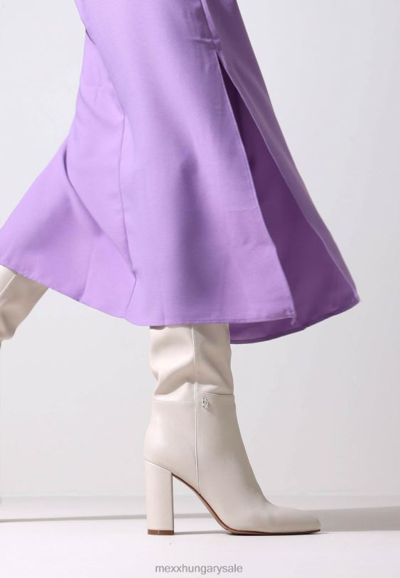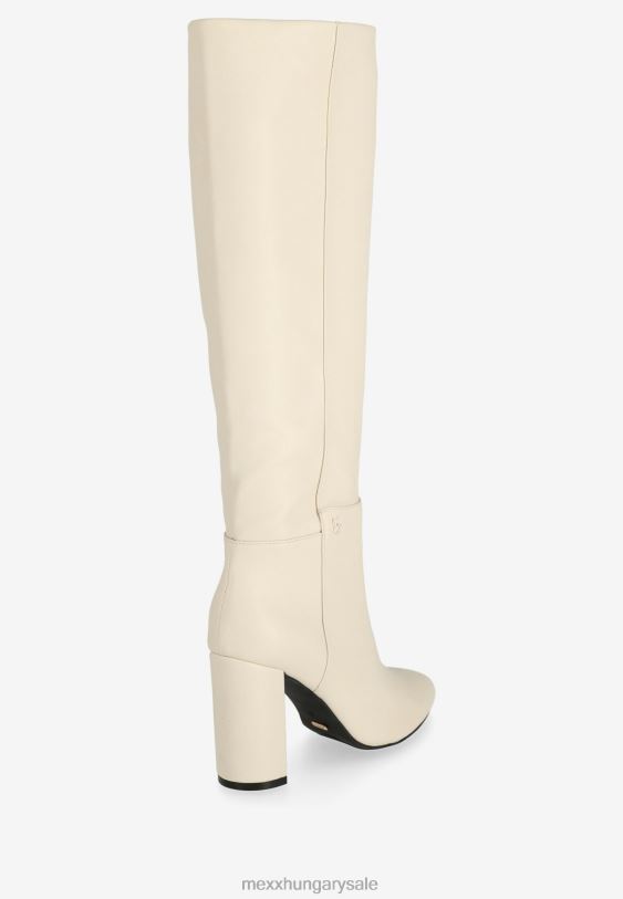 törtfehér magas női csizma a mexx-től. hegyes orr és fél cipzár. magas blokksarok. egy piros x a talpán a szerelmi történet aláírásaként, hogyan született meg a mexx. csókkal kezdődött. azt tanácsoljuk, hogy rendszeresen permetezze be a csizmát víz és szennyeződés ellen.
