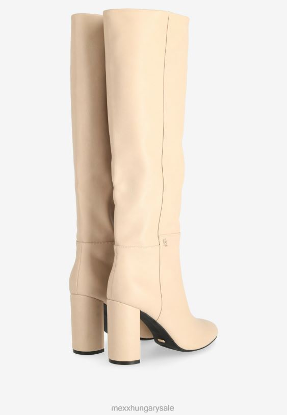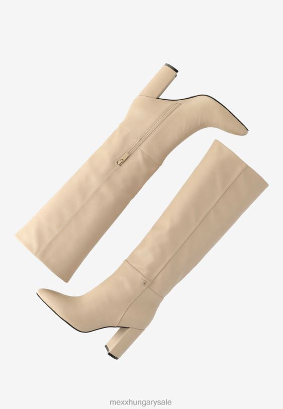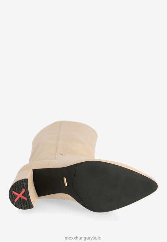 homokszínű magas női csizma a mexx-től. hegyes orr és fél cipzár. magas blokksarok. egy piros x a talpán a szerelmi történet aláírásaként, hogyan született meg a mexx. csókkal kezdődött. azt tanácsoljuk, hogy rendszeresen permetezze be a csizmát víz és szennyeződés ellen.